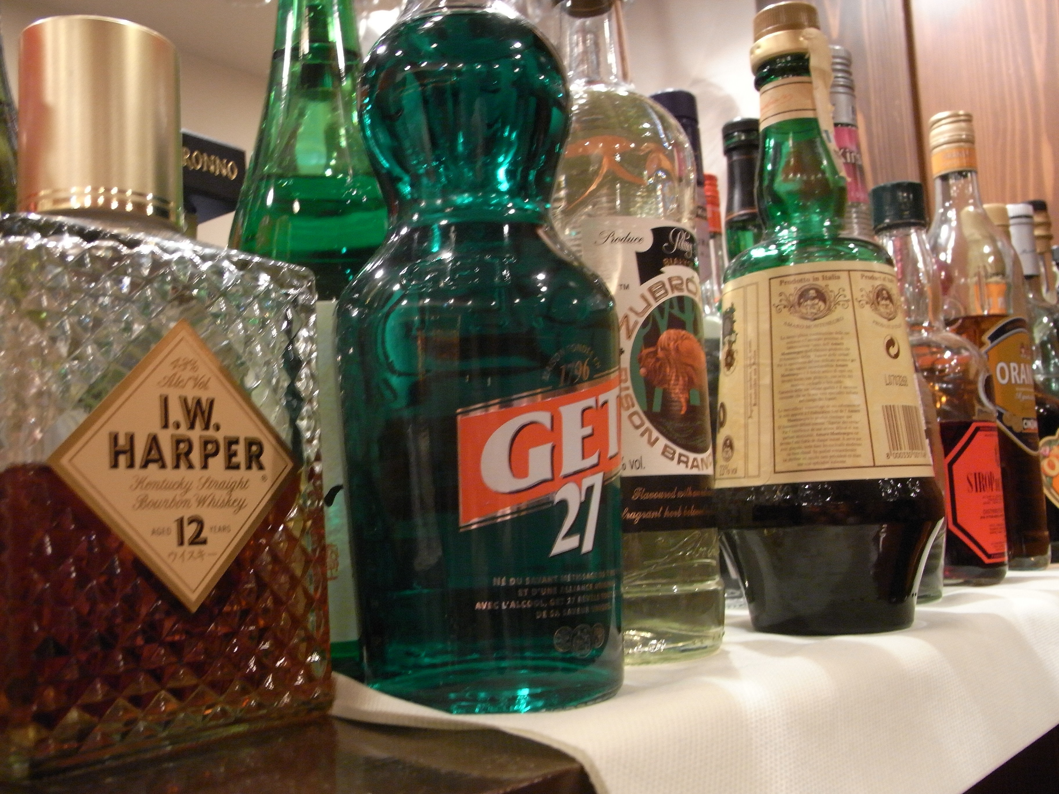 席のまわりには、お酒の ボトルが盛りだくさん!