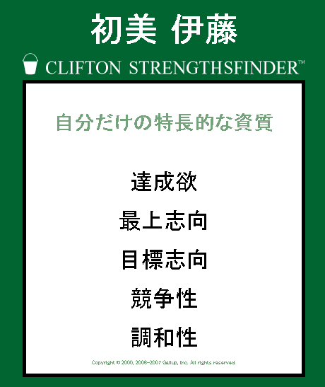「自分だけの特長的な資質」のレポートは、あなたのStrengthsFinderの結果に基づき、上位5つの資質を強い順に並べたものです。 全34項目中、これらの資質があなたの強みの上位5つです。