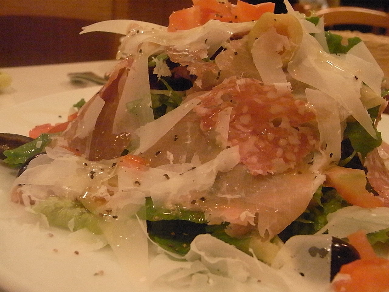 生ハム、サラミ、チーズ、イタリア食材いっぱいの市場風サラダです。