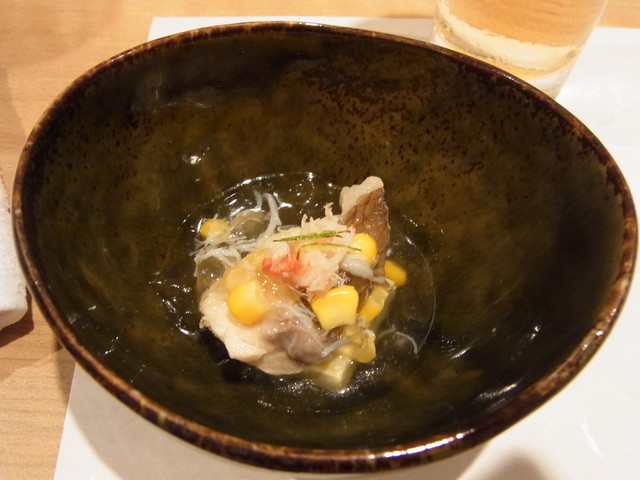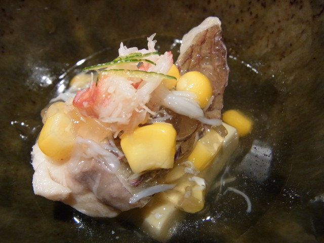 ▼「カニ味噌豆腐と真鯛 玉蜀黍の旨出汁ジュレ掛け」