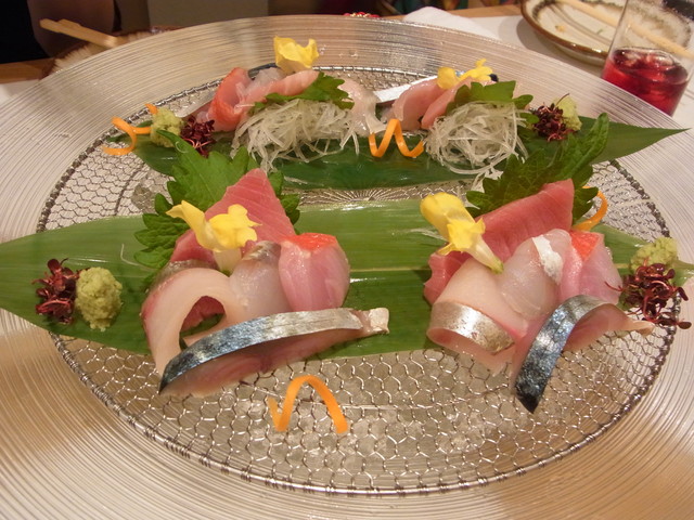 本マグロ、コチ、シマアジ、金目鯛、しめ鯖の盛り合わせです。