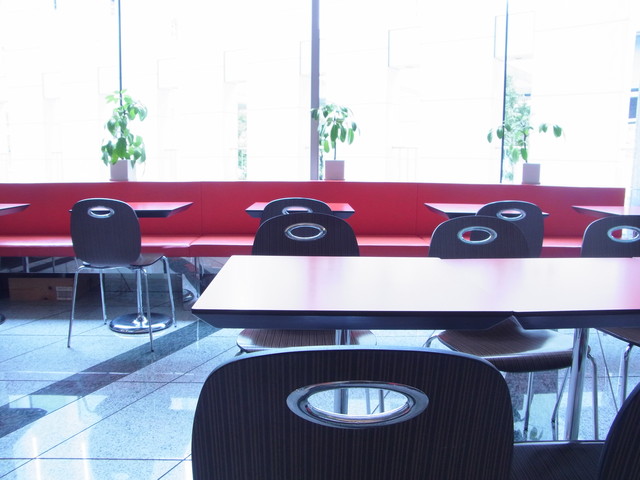 大きな窓でとても明るい店内は、真っ赤なソファが特徴的です。