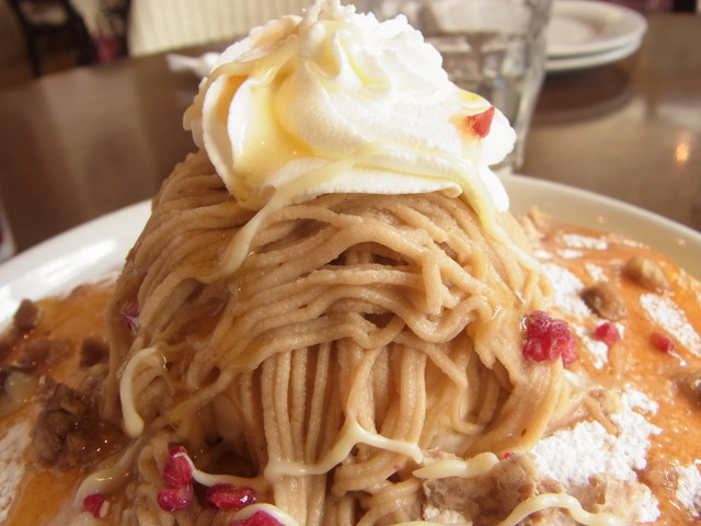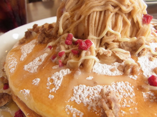 こちらのボリュームで1300円。秋らしく、マロンのパンケーキにしました!