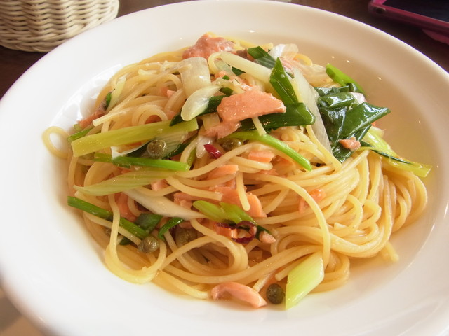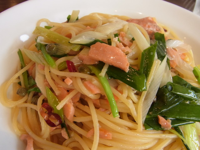 ▼「スモークサーモンと4種類のねぎのパスタ」