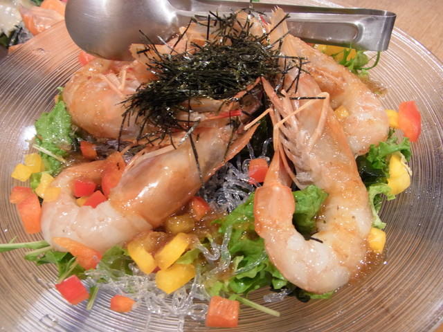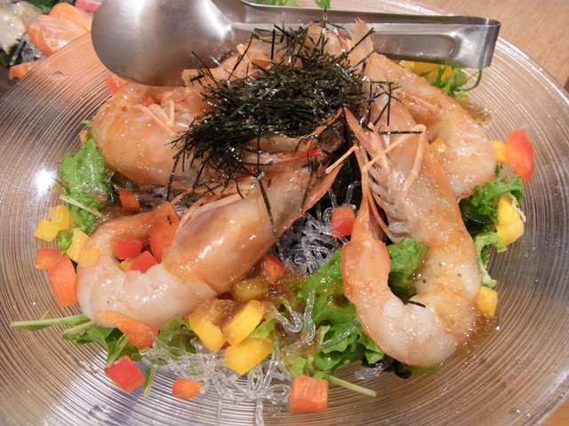 サラダは大きな海老入り!!特大ボタン海老と海藻の和風サラダ。