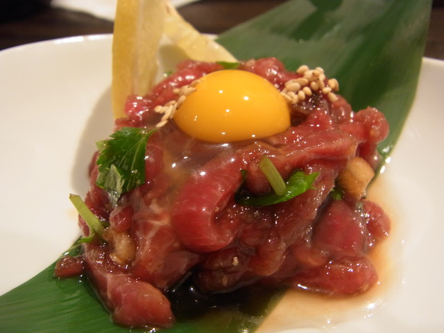 朝挽きした新鮮なお肉に、たれとたまごを絡めて。