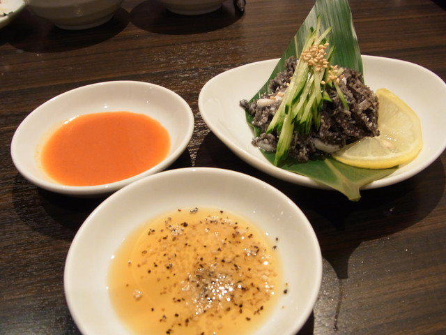 たれとごま油の2種類のつけだれで頂きます。
