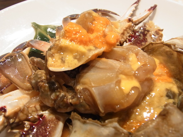 凍ったままの渡り蟹を秘伝の醤油に漬けたもので、これがまたお酒に合うんです。