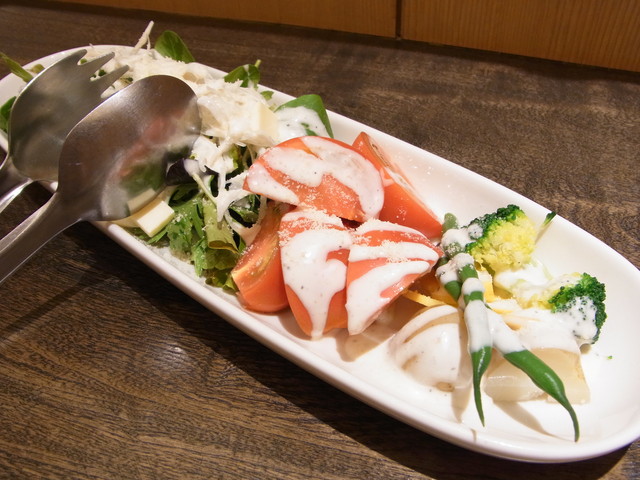 トマト、ブロッコリー、かぶ、アスパラ、レタスの上にたっぷりのドレッシング。