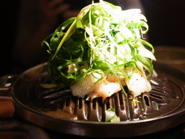 たっぷりのネギと一緒に頂きます。お肉の厚みもあってジューシーです。