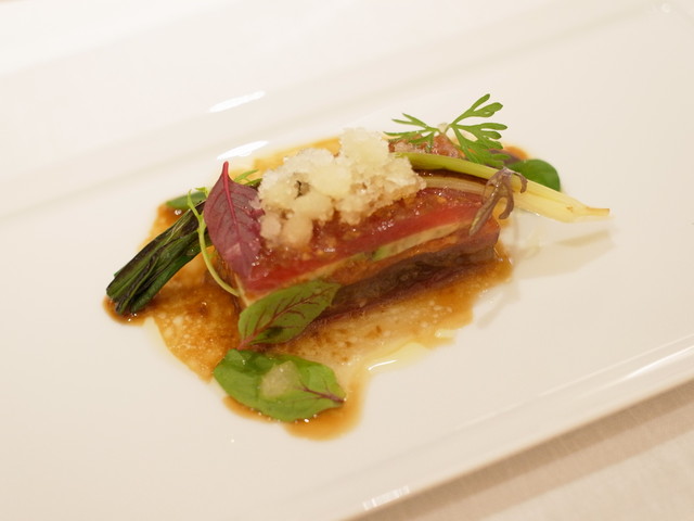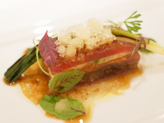 ▼「マグロとソイオニオンとアボカドのプレス サンドライトマト、アボカド、柚子のグラニテ」
