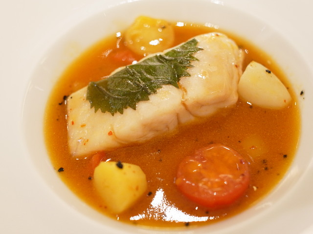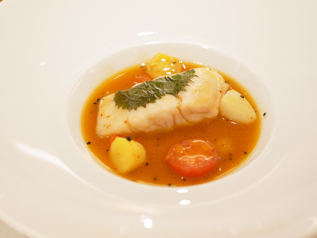 ▼「ゆっくり蒸しあげた天然鯛、フェンネルの香り トマト、ブラックオリーブ、ポテトを添えて」