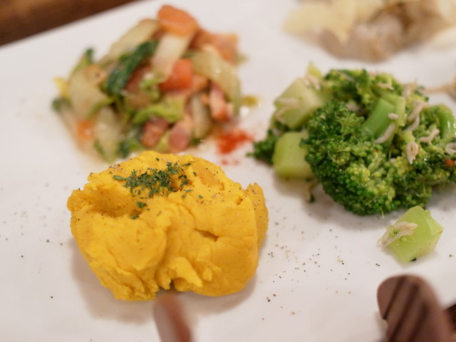 カボチャのマッシュサラダ、ブロッコリーとしらすのピリ辛ビネガー和え、