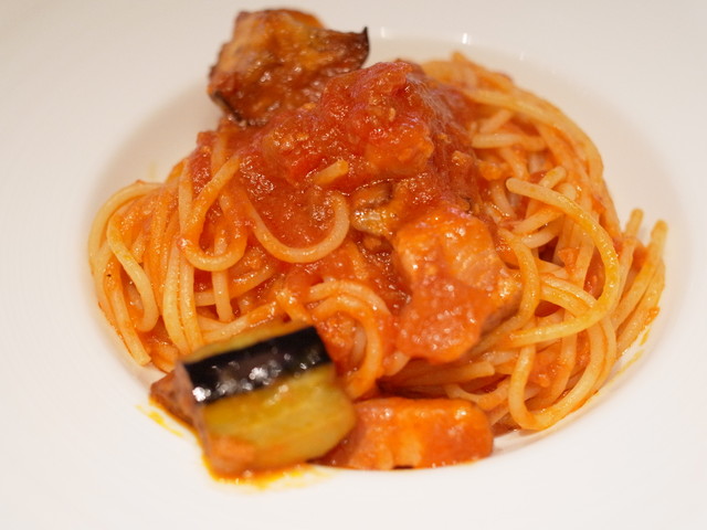 シンプルなトマトパスタですが、大きな茄子が入っていて美味しい。
