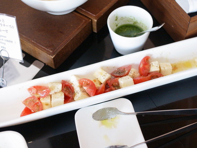 カプレーゼはバジルのソースで頂きます。