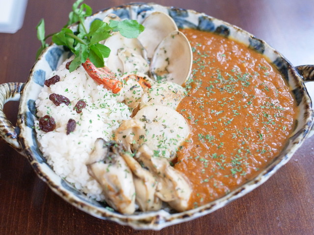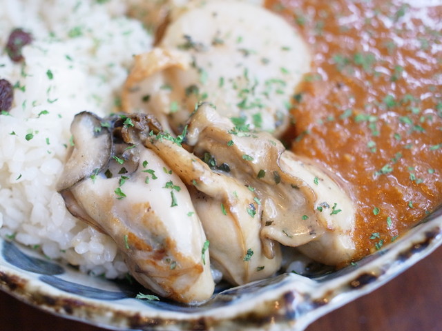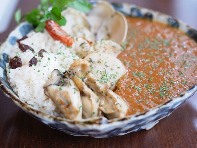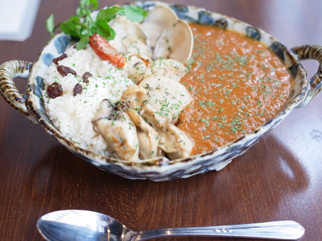 牡蠣、海老など大ぶりな魚介に南インド風のスパイスが効いたカレー。