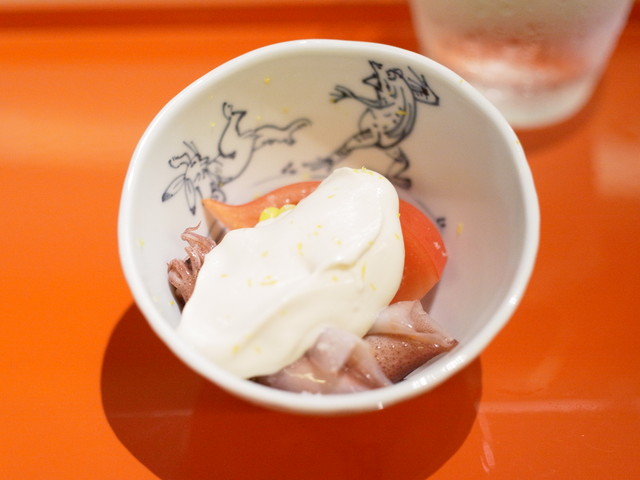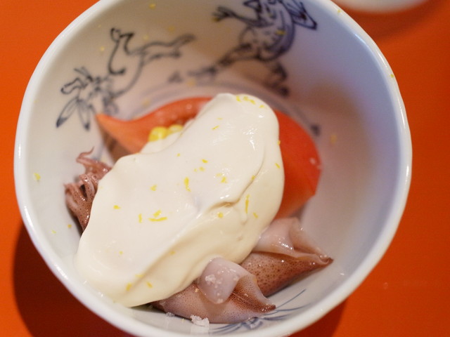 フルーツトマト、玉蜀黍、蛍烏賊は白和えで頂きます。