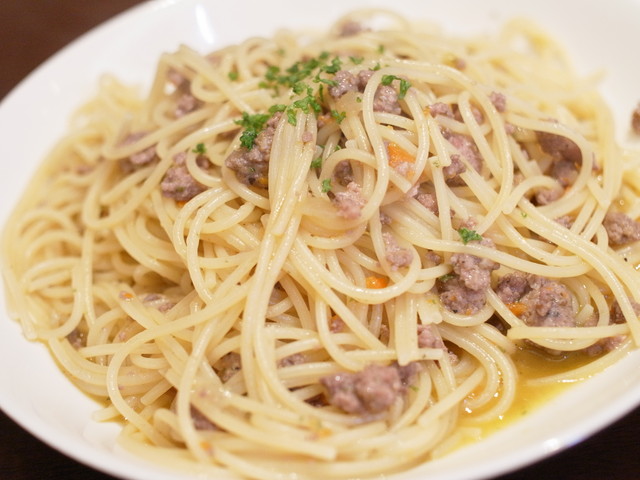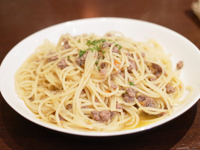 太めのスパゲッティはしっかりした食感で、オイルとお肉が絡んで美味しい。
