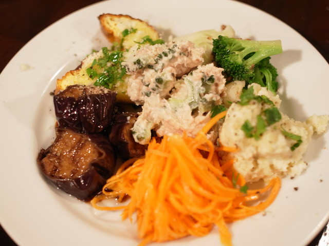 キャロットラペに、茄子のマリネ、フリッタータ、ブロッコリーとカリフラワーのアンチョビ和え。