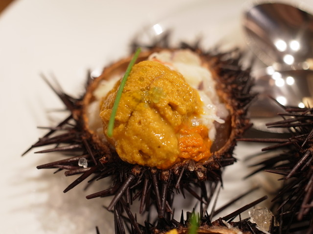 殻つき生ウニにハマグリジュレ、ホタテ、ズワイ蟹が詰め込んであります。