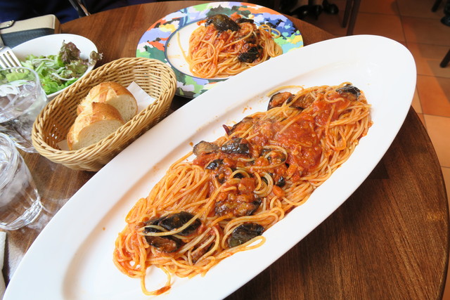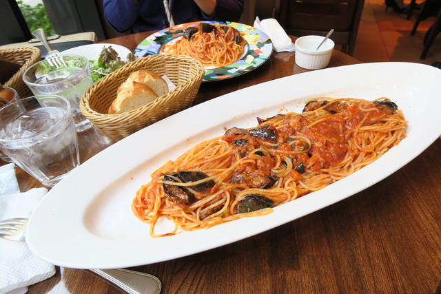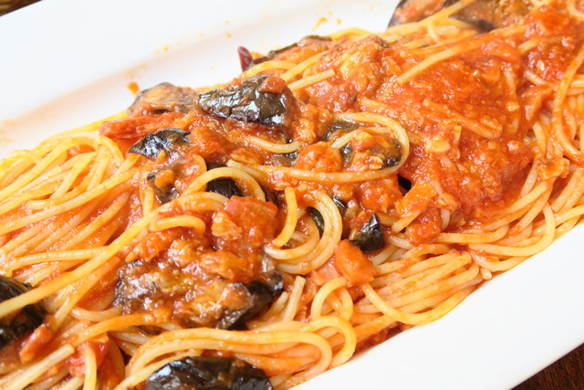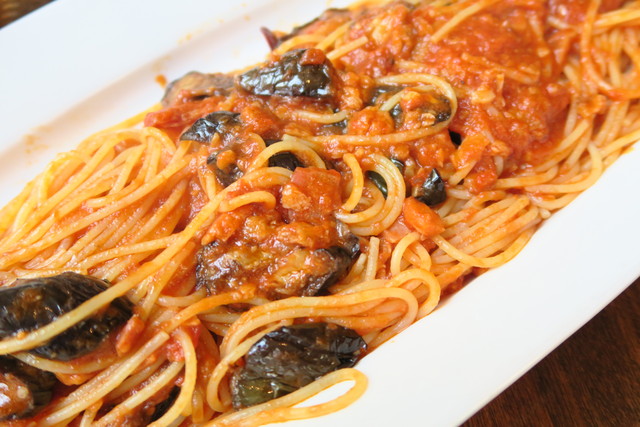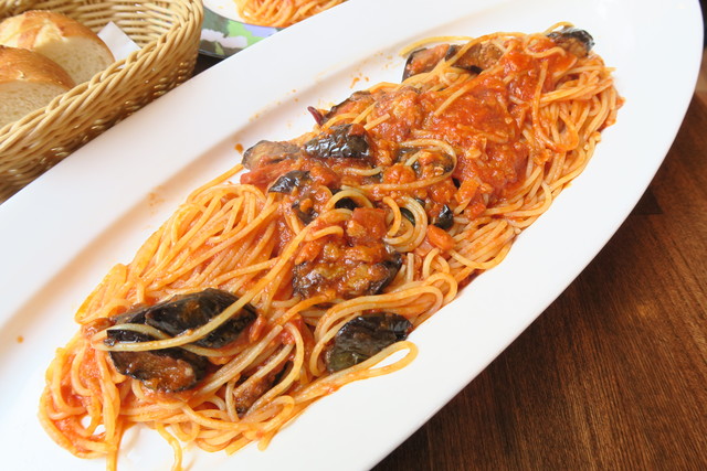 ハツがチョイスしたのは、茄子とベーコンのトマトソーススパゲッティ。
