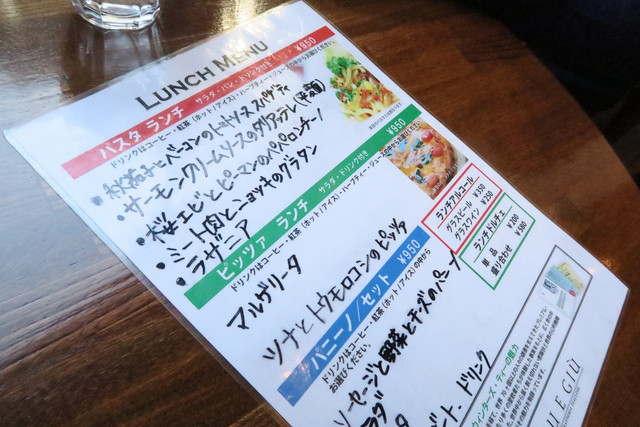 ランチメニューは、パスタ、ピザなど数種類。