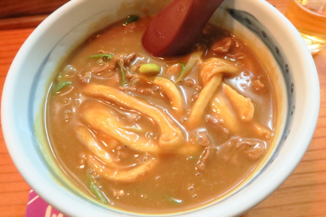太めのしっかりとしたコシがあるうどんに、おでんの出汁でも使われているあっさりしたお出汁、そしてさらっとしているカレー。