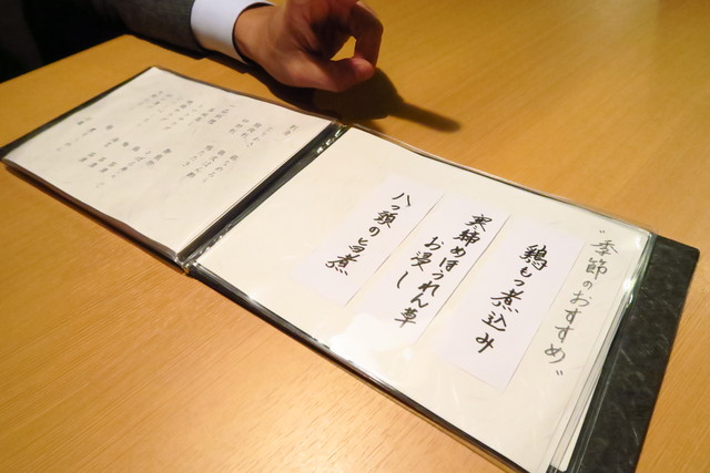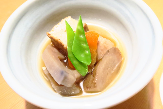 お通しは野菜の煮物でした。蓮根やゴボウ、ニンジンなどの根菜が柔らかく煮てあり、厚揚げにもたっぷりお出汁がしみ込む。