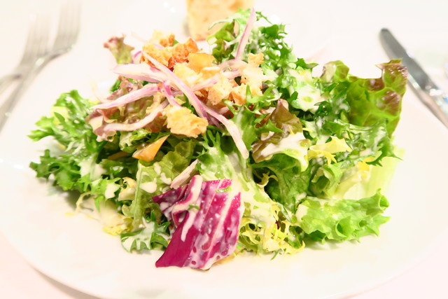 色鮮やかなグリーンに、サクサク食感のクルトン。ドレッシングはフレンチ風でおいしいです。