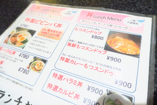 韓国料理的な雰囲気のビビンバやスンドゥブなど。でもスンドゥブにはやっぱりもつが入っているですね。