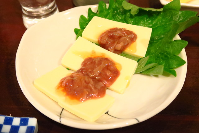 かつを酒盗チーズ。どんなメニューかと思いきや、チーズの上にかつおの酒盗が乗っているんです。