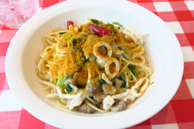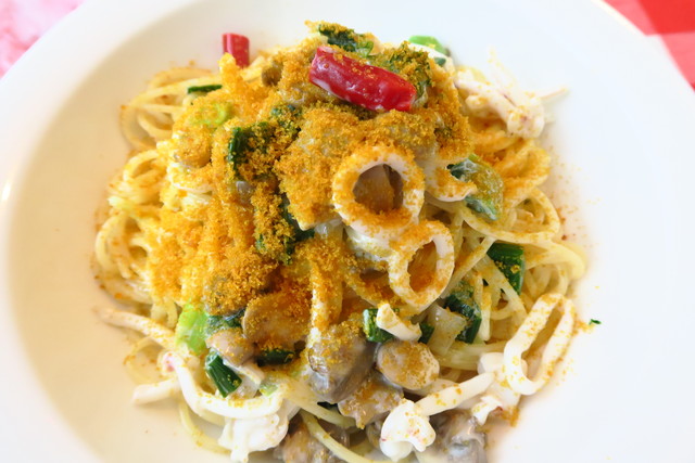「ヤリイカと葉玉葱のからすみクリームスパゲッティ」