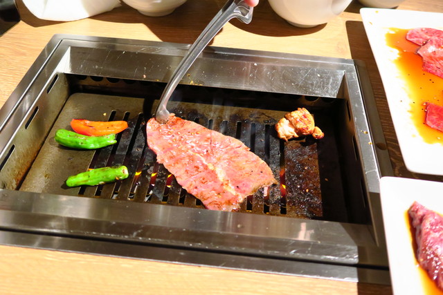 鉄板の上で焼いていきます。ちょっとテーブル狭め。