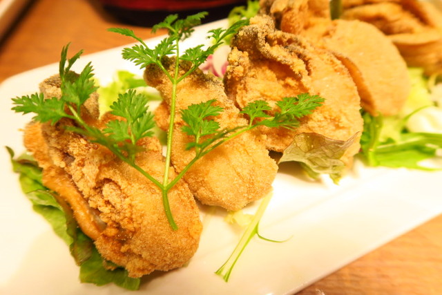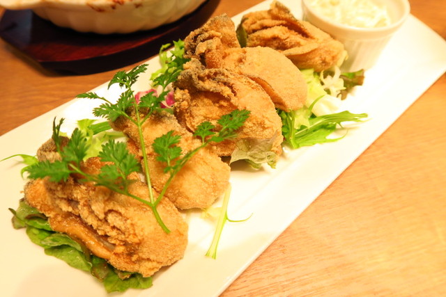 牡蠣のセモリナ揚げ。セモリナ粉を使っているので、衣がカラッとしてる。