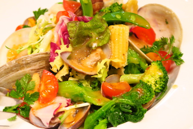 色鮮やかなサラダは、ブロッコリーやコーン、トマトなどの野菜にあわせてたくさんの貝が入っています。