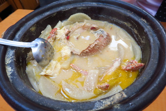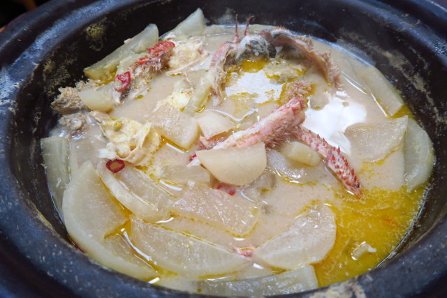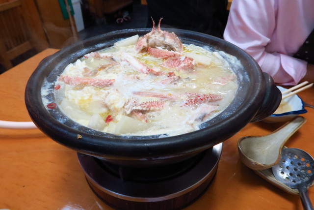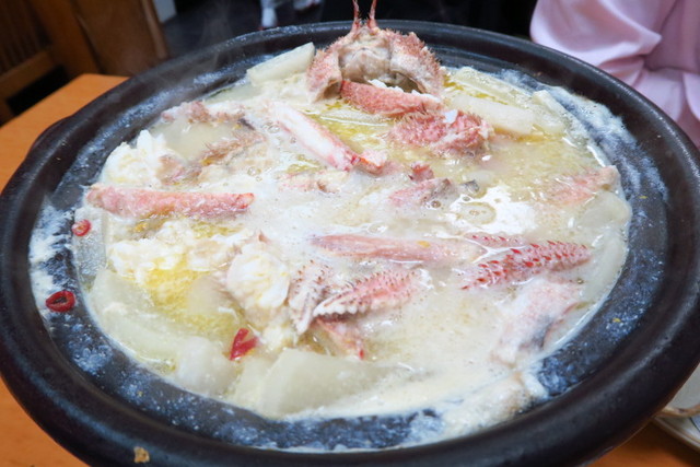]こちらが、名物の「蟹大根鍋」。シンプルに、大根と蟹のみのお鍋なんですよ!これにはびっくり。