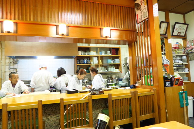 一軒家のお店で、2階もあるのでしょうか。慌ただしく働く、割烹着のおばちゃんたちがなんだかカワイイw