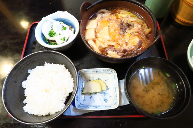 お鍋の中には絹豆腐に、牛肉が卵でとじてあり、甘めのつゆで煮込まれています。