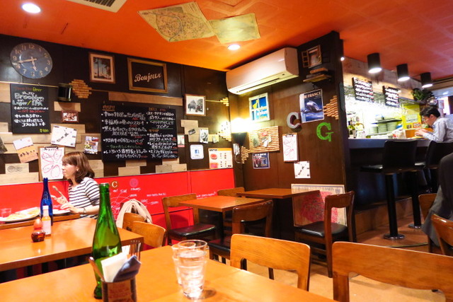 カウンターとテーブルあわせて30席で、赤を基調にしたバルらしい雰囲気です。