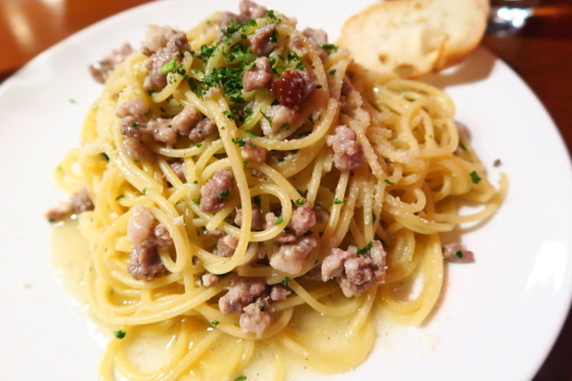 粗めの豚ひき肉を白ワインとハーブで煮込んだラグソース。