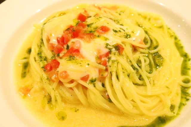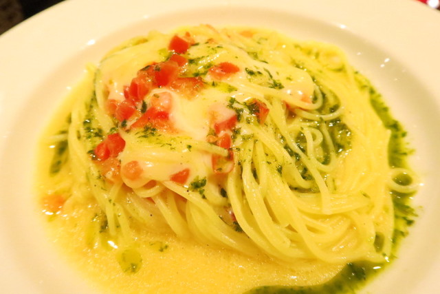 フレッシュトマトととろけるチーズのオイルパスタ バジルソースがけ。