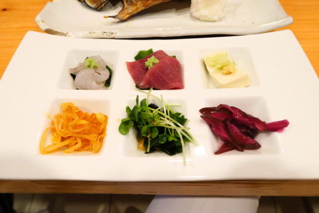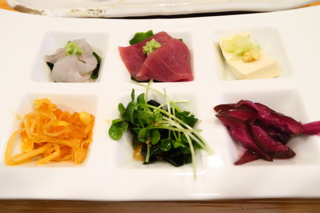 お刺身が2種類に、お豆腐、お漬物など6種類。