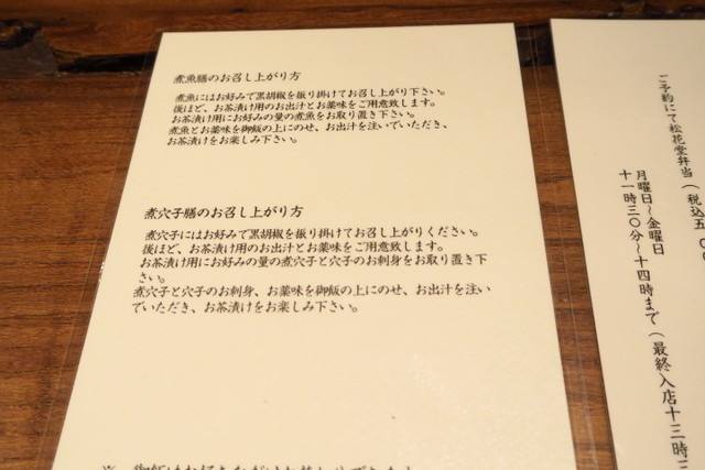 煮魚膳(\1.600)、煮穴子膳(\2,500)、予約で松花堂弁当(\5,000)の3種類。