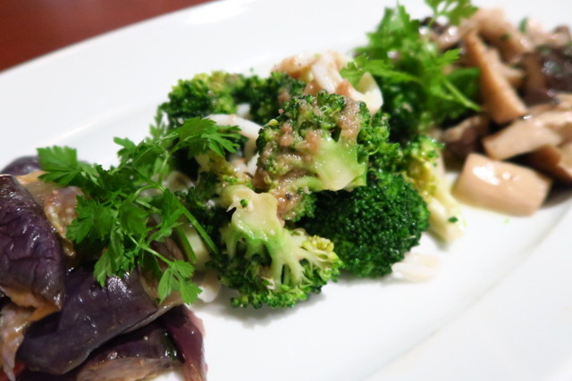 大好物のイカとブロッコリーのアンチョビソースに、キノコのソテー、そしてラタトゥユ。