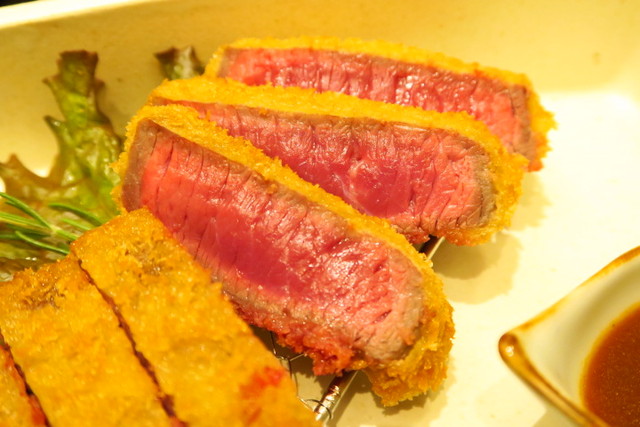 レアに揚げられた牛かつは、こぶりですが7切れほど。