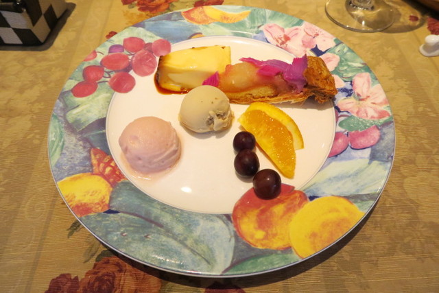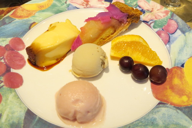 葡萄のシャーベット、ミルクティーのアイス、紫芋と林檎のパイ、メルローの葡萄、カスタードプリン。