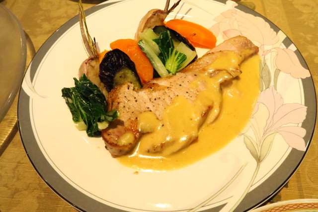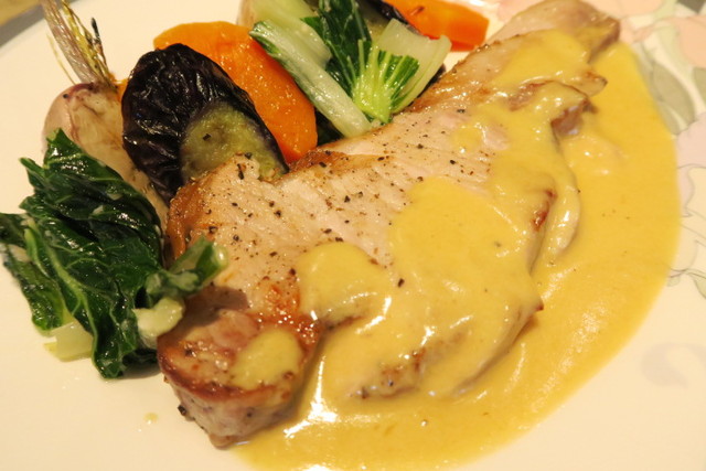 豚肉にゆっくりと火を通してソテーし、西洋ワサビのソースがたっぷりかかっています。