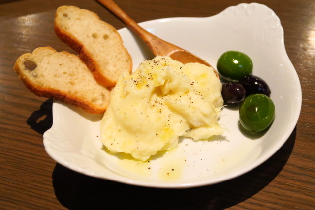 こちらはお通しのマッシュポテトにオリーブ。