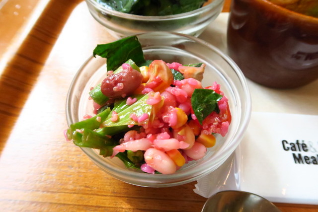 キヌアとお豆のサラダ。もう一品は、ひじきたっぷりのサラダ。