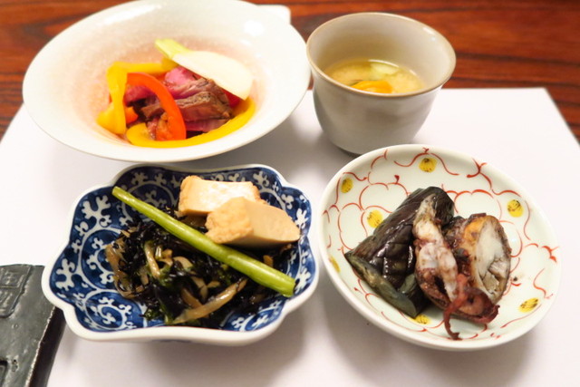 ひじきと厚揚げの煮物や茄子とタコなどほっこりする和食のラインナップです。